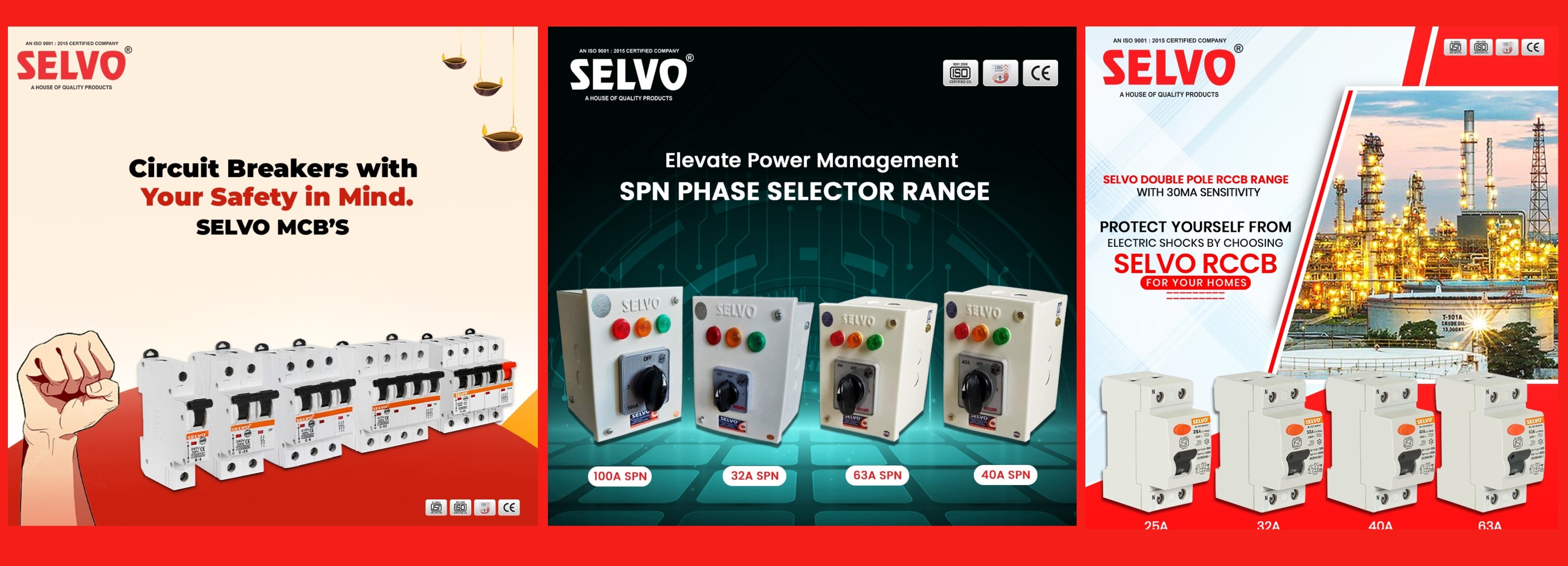 SELVO MCB's are accredited with ISO 9001:2015 certification for adheres to excellent quality product management system as part of its production process. The MCB's is ISI Marked as per IS/EC 60898-1:2015 awarded by Bureau of Indian Standards (BIS). Selvo RCCB are accredited with ISI marked as per IS:12640 which is a testimony to its strict & vigilant quality control. Our Distribution Board range are aesthetically designed & manufactured using CRCA sheets which are harder with smooth surface and known for its better dimensional accuracy and are further powder coated which make enclosure cotrosion resistant with attractive finish. The Switch fuse units, offload changeovers as well as busbars are also manufactured using CRCA sheets and good quality raw materials such as electrolytic copper and brass, the contacts and terminals are silver plated for low power loss and better conductivity.