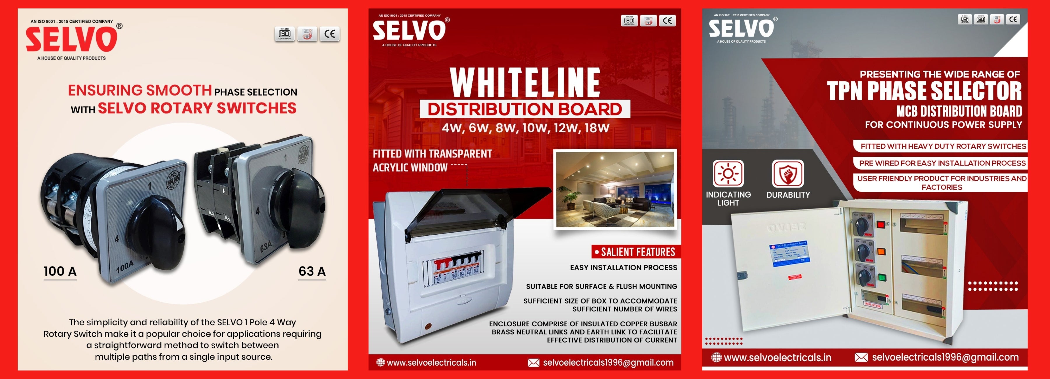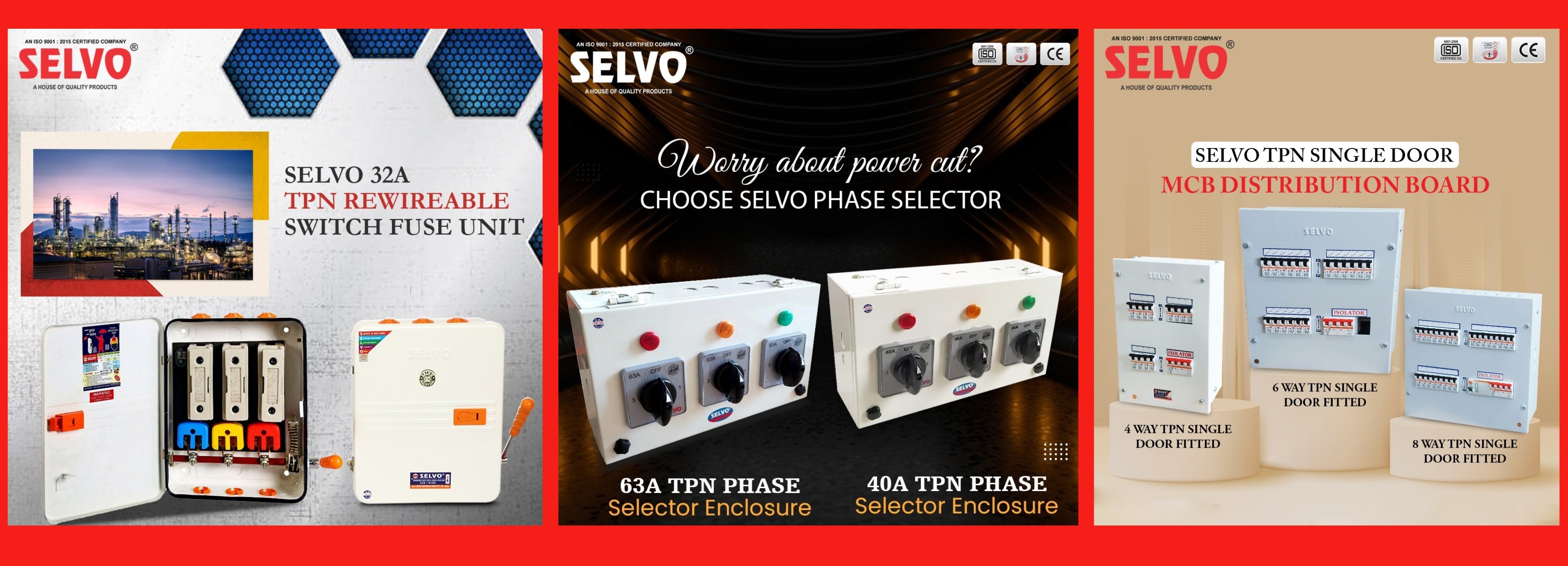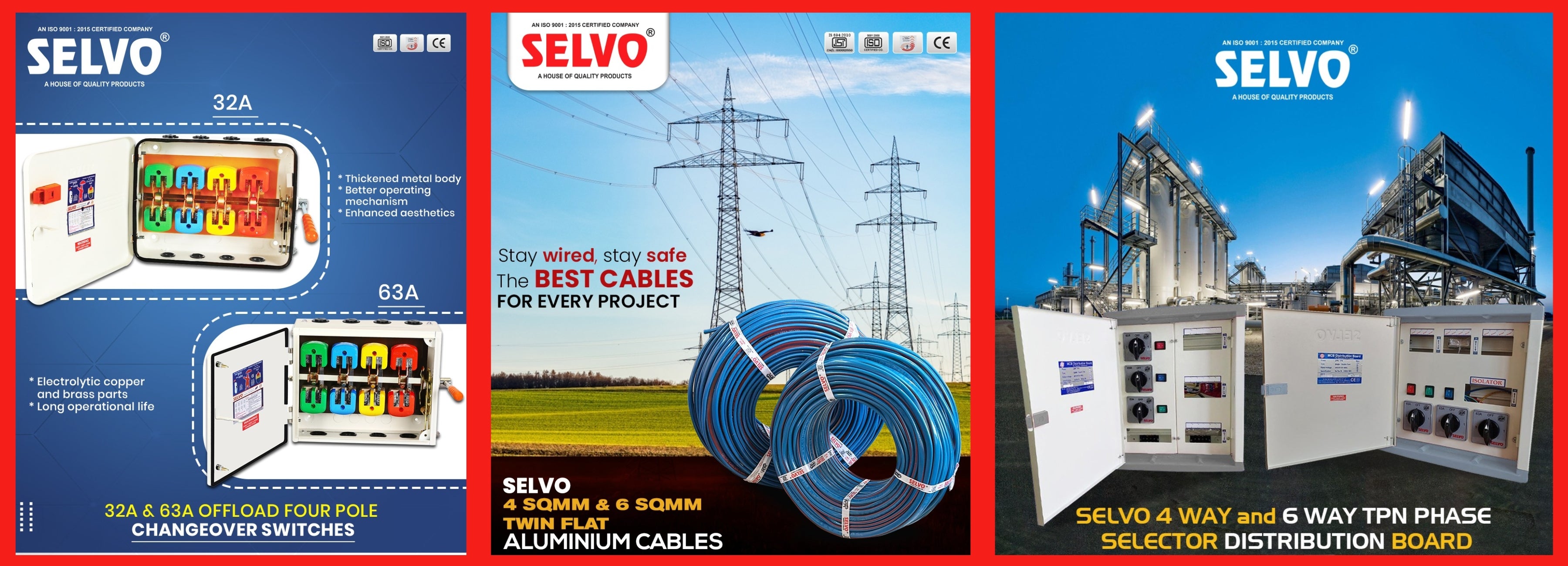 The company boast of state of the art infrastructure & highly skilled workforce which enables it to develop product of highest quality which also met all the specifications and have better warranty and adheres to stringent timelines period. SELVO offers wide range of Switchgears for our esteemed customers across the world which comprises of MCB's, Isolators, RCCB's, MCB type Changeovers, Premium quality Distribon Boards, Rewireable Switch Fuse Units, Offload. Changeovers, Busbars, Porcelain Fuse Units (Kitkat), Fuse Distribution Box, Phase Selector Switches & Phase Selector Enclosure.